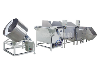 簡易油炸生產線Ⅲ型由油炸機、浸油機、脫油機和拌料機組成。其中各部分均可單獨作業的。溫度、油炸時間、脫油時間全部由PC機自動控制,炸制效果穩定均勻性好,能有效地控制食品含油量。加工出的產品,香脆可口、味道純正,是生產油炸花生、蠶豆等堅果類食品的設備。