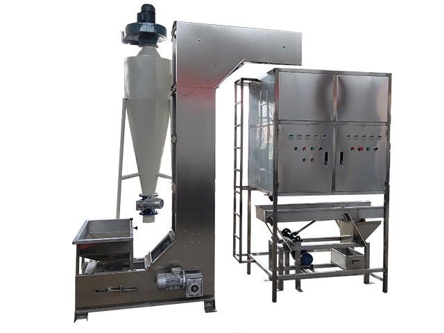 該機采用氣動原理,全自動數字控制,將炒熟或者烘干后的堅果仁及籽仁進行無損脫皮,脫皮率高、脫皮后光滑無傷、皮和仁自動分離。